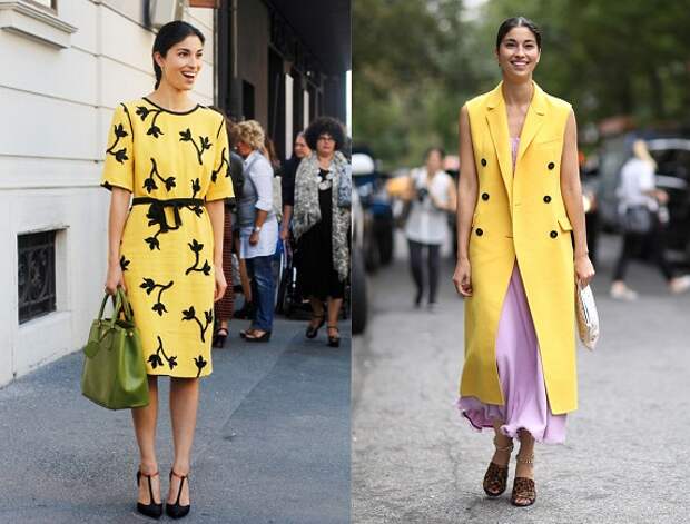 У этого цвета огромная солнечная энергия. Первыми на вооружение его берут женщины теплого контрастного типажа – чаще всего насыщенный желтый выгуливают темноволосые итальянки, либо более нейтральные девушки с рыжинкой в волосах.