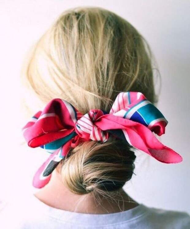 Да, платок может служить резинкой для волос. На самом деле не совсем резинкой, а скорее украшением, которое эту резинку спрячет. Сделайте аккуратный пучок, закрепите его привычными способами, а сверху завяжите яркий платок в виде большого банта. Красота!