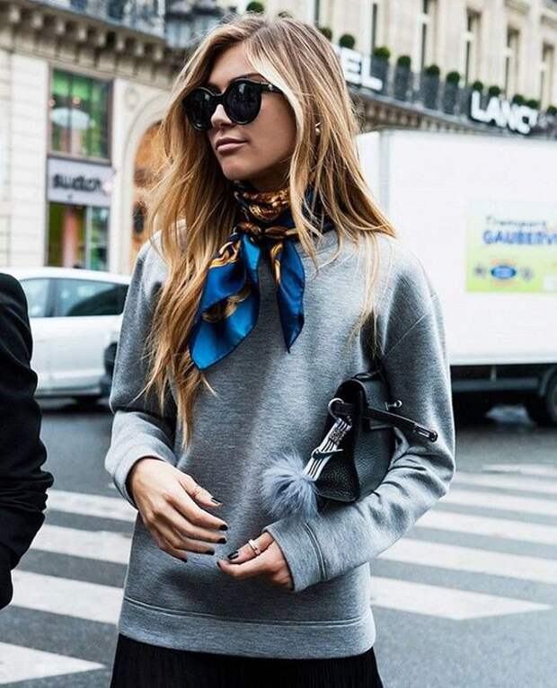 Перед выходом на прогулку украсьте скучную чёрную или бежевую сумку разноцветным платком — и старый аксессуар заиграет новыми красками! Платок может сочетаться с вашим нарядом или, наоборот, быть единственным ярким акцентом в образе.