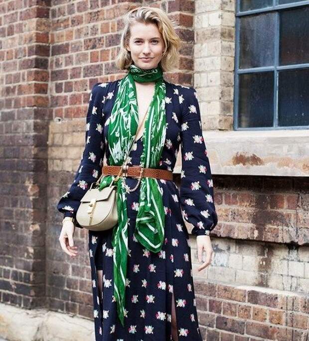 Довольно необычный и интересный способ носить платок (и совсем не обязательно шёлковый) — обмотать его вокруг шеи и заправить длинные концы под тонкий ремень. Единственное условие — платок должен быть достаточно большим, чтобы его края были ниже уровня вашей талии.