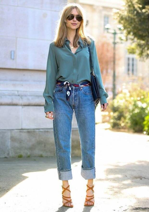 Ещё одна весьма популярная идея по модному применению яркого шёлкового платка — использовать его в качестве ремня. Сверните платок в жгут (или просто тонкую полосу), проденьте через шлёвки (петли для ремня) и завяжите концы в аккуратный узел. Готово!