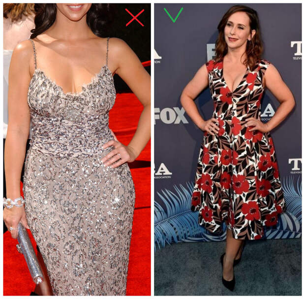 Обратите внимание, здесь платье А-силуэта выглядит гармоничней обтягивающего, а ведь Дженнифер на обоих фото очень стройная (возможно в красном платье даже чуть полнее). Небольшое расширение юбки скрывает бедра: