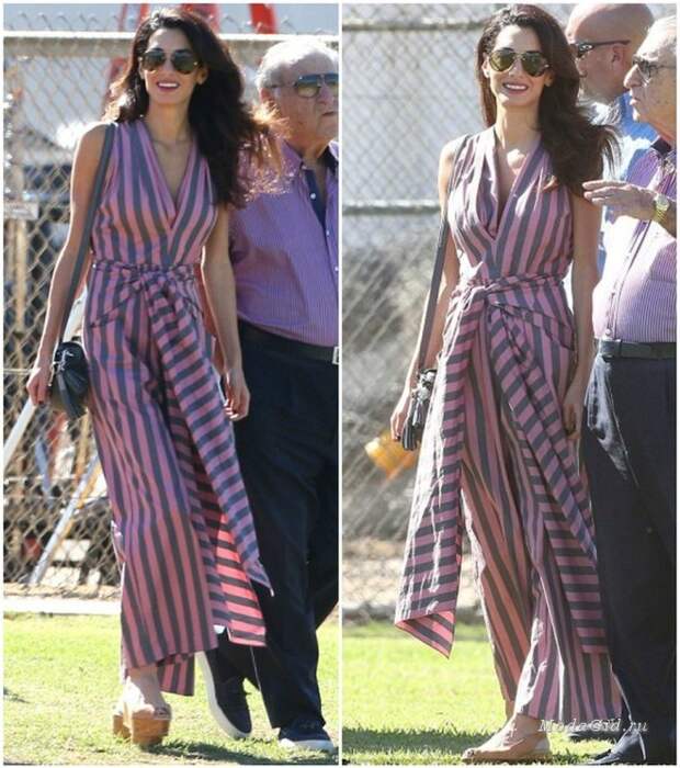 21 октября на встречу со своим отцом Амаль Аламуддин-Клуни надела оригинальный полосатый комбинезон с узлом спереди от дизайнерского бренда Tome, дополнила образ босоножками Jimmy Choo на платформе и очками-авиаторми Linda Farrow.