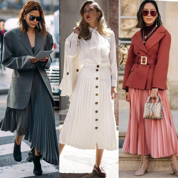 Топовые образы с юбкой плиссе нежные, утонченные, способны визуально скрывать недостатки фигуры.