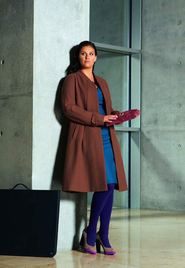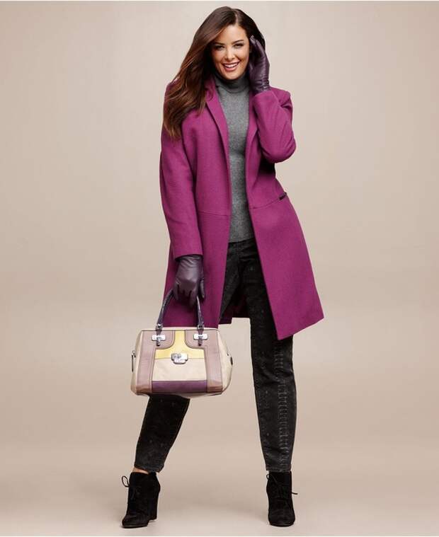 4. Смещаем акценты. Пальто будет лучше маскировать полноту фигуры и смотреться интереснее, если оно скроено по косой и имеет асимметричный воротник. Асимметрия кроя несколько путает восприятие, и фигура выглядит стройнее, а образ в целом – изысканнее. Удлиненное пальто, сконструированное подобным образом, отлично комбинируется и с классической, деловой, и с джинсовой одеждой.