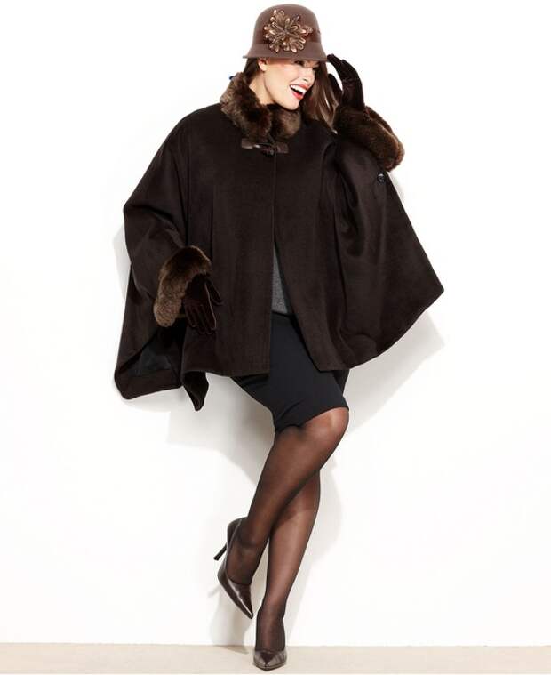 2. Этнические мотивы. Пальто-пончо – это очень комфортная модель. И, в отличие от множества других объемных фасонов пальто, оно не делает полную фигуру необъятной. Пончо скроет неэстетичные складки на животе и бедрах, сохранив при этом элегантность образа. Лучше всего такой фасон пальто сочетается с зауженными книзу юбками или брюками.