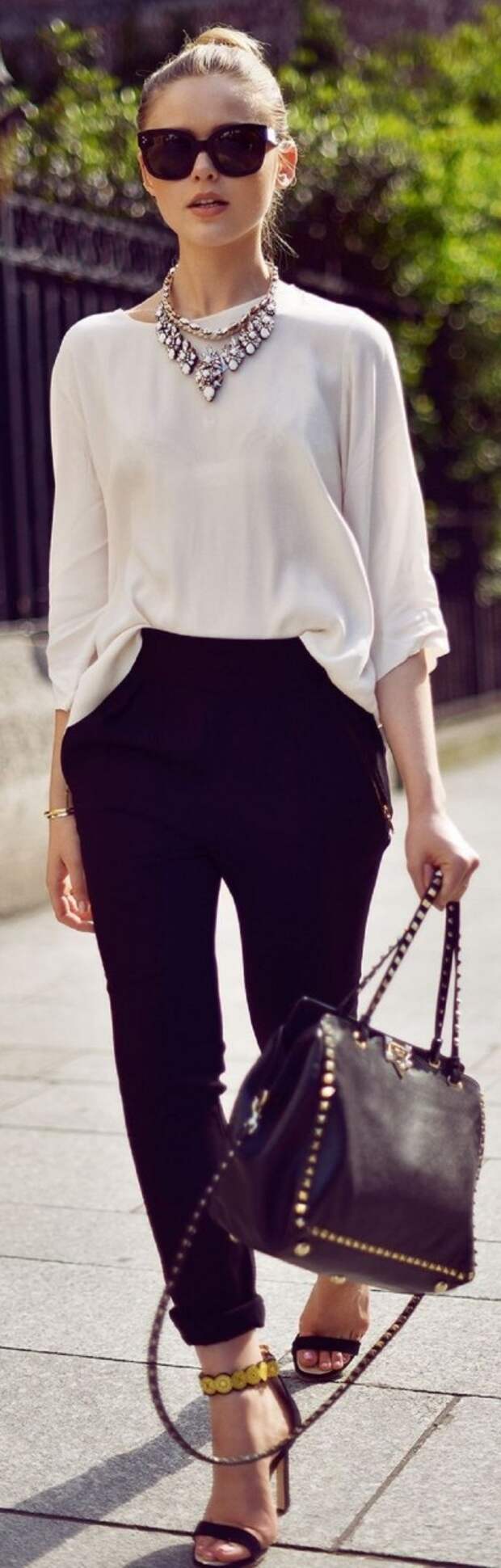 - Темная сумка очень гармонично выглядит в таком наряде.