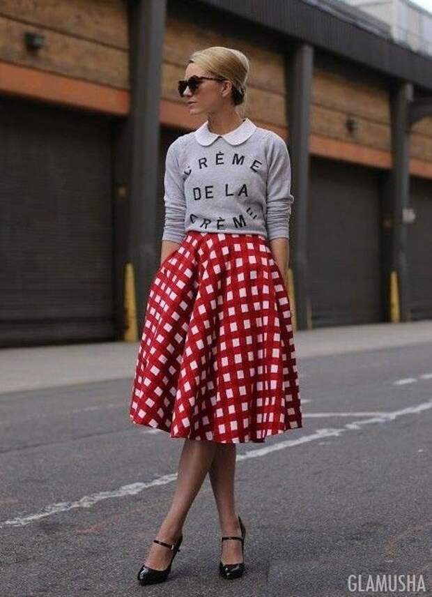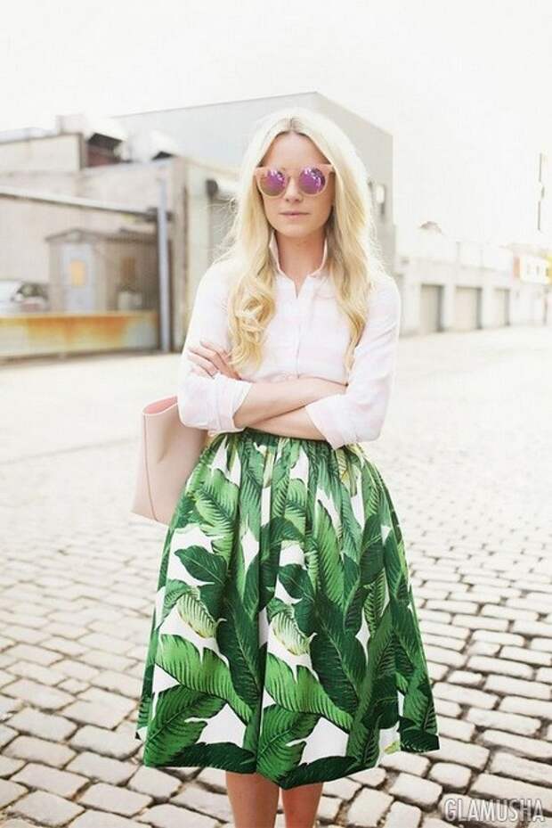 Чем вычурней принт на юбке, тем проще должен быть верх. Сыграйте на спокойном контрасте.