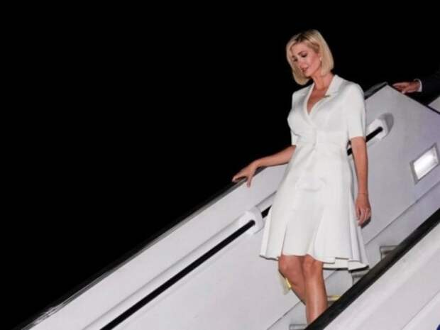 Для перелета американская икона стиля выбрала максимально комфортный образ, поэтому Иванка появилась в аэропорту в льняном платье с оранжевыми цветочными аппликациями на подоле, рукавами-фонариками и широким поясом, завязанным спереди на бант.