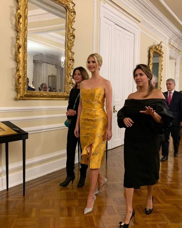 Если бы за умение одеваться давали титул, то Иванка, определенно, получила бы звание «Мисс элегантность»! Это эффектное золотисто-желтое платье с мелким цветочным принтом и воланами от Johanna Ortiz женщина надела для торжественного ужина. С точки зрения политики, выбрать для вечернего мероприятия платье от самого лучшего колумбийского дизайнера — отличный ход!